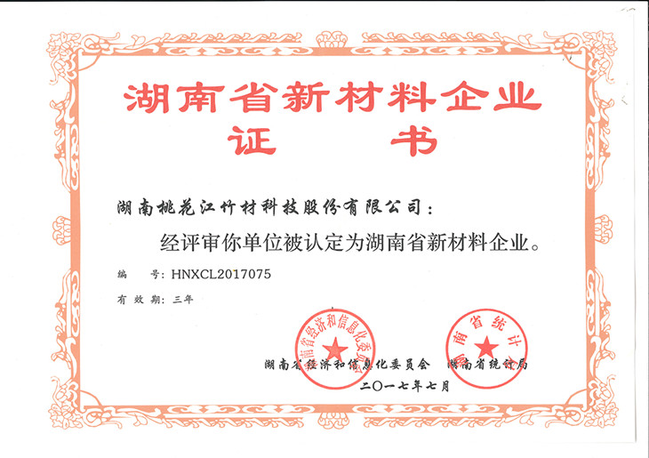 2017年7月,湖南省經(jīng)濟(jì)和信息化委員會、湖南省統(tǒng)計(jì)局為湖南桃花江竹材科技股份有限公司正式頒發(fā)“湖南省新材料企業(yè)”證書(證書編號:HNXCL2017075)。湖南省新材料企業(yè)的認(rèn)定,標(biāo)志著湖南桃花江竹材科技在新型竹材領(lǐng)域的成績得到國家認(rèn)可與支持,是一項(xiàng)極具含金量的突破性榮譽(yù)。作為中國竹業(yè)龍頭企業(yè),湖南桃花江竹材科技一直走在新型竹材研發(fā)、運(yùn)用和推廣的前沿,為全球竹產(chǎn)業(yè)的發(fā)展持續(xù)貢獻(xiàn)力量。